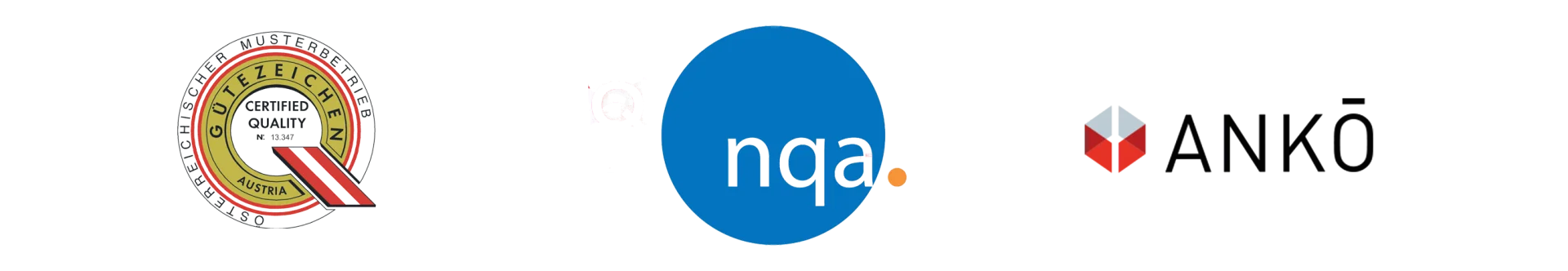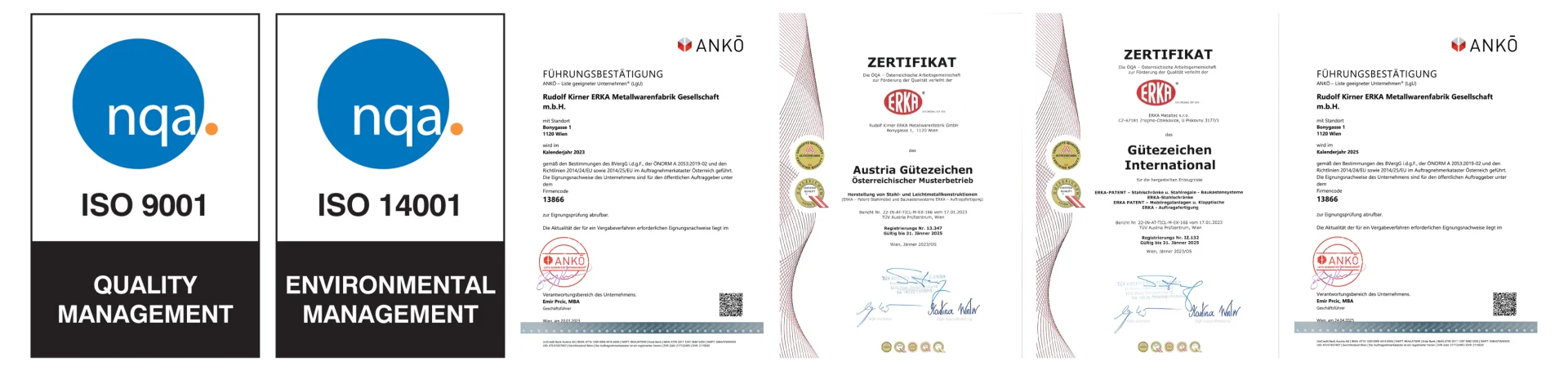 Díky tomu a v kombinaci s nadprůměrnou kvalitou výrobků a neustálou kontrolou je ERKA oprávněna nosit následující certifikáty!